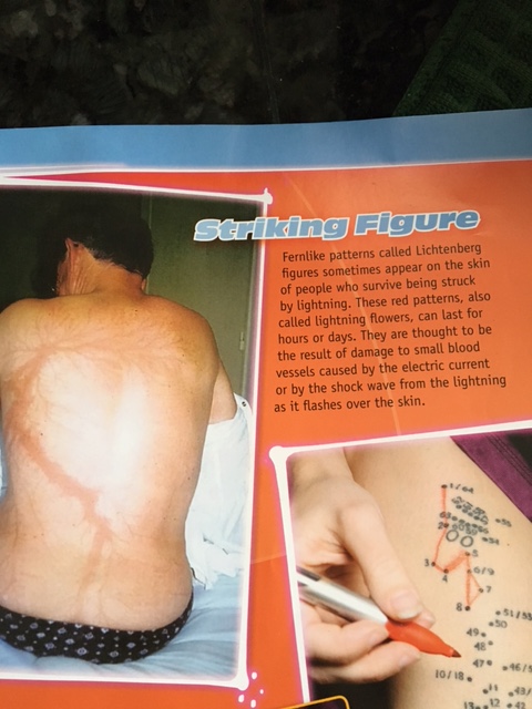 <—— This did not happen to anyone in our household, but when the lightning struck blue sparks flew out of an appliance on the wall, there was a sound like glass hitting a counter, and the hair on my arms stood on end. Immediately we knew there was a gas leak — we could smell it. If nothing else, we’ve learned that we should have gotten out of the house immediately instead of waiting for the service person. He came in, smelled the gas, and walked right back out. For a month we’ve been working with contractors because, in all, there were six gas leaks. Drywall was ripped from three rooms to follow the pipes, another manifold was put in, etc.
